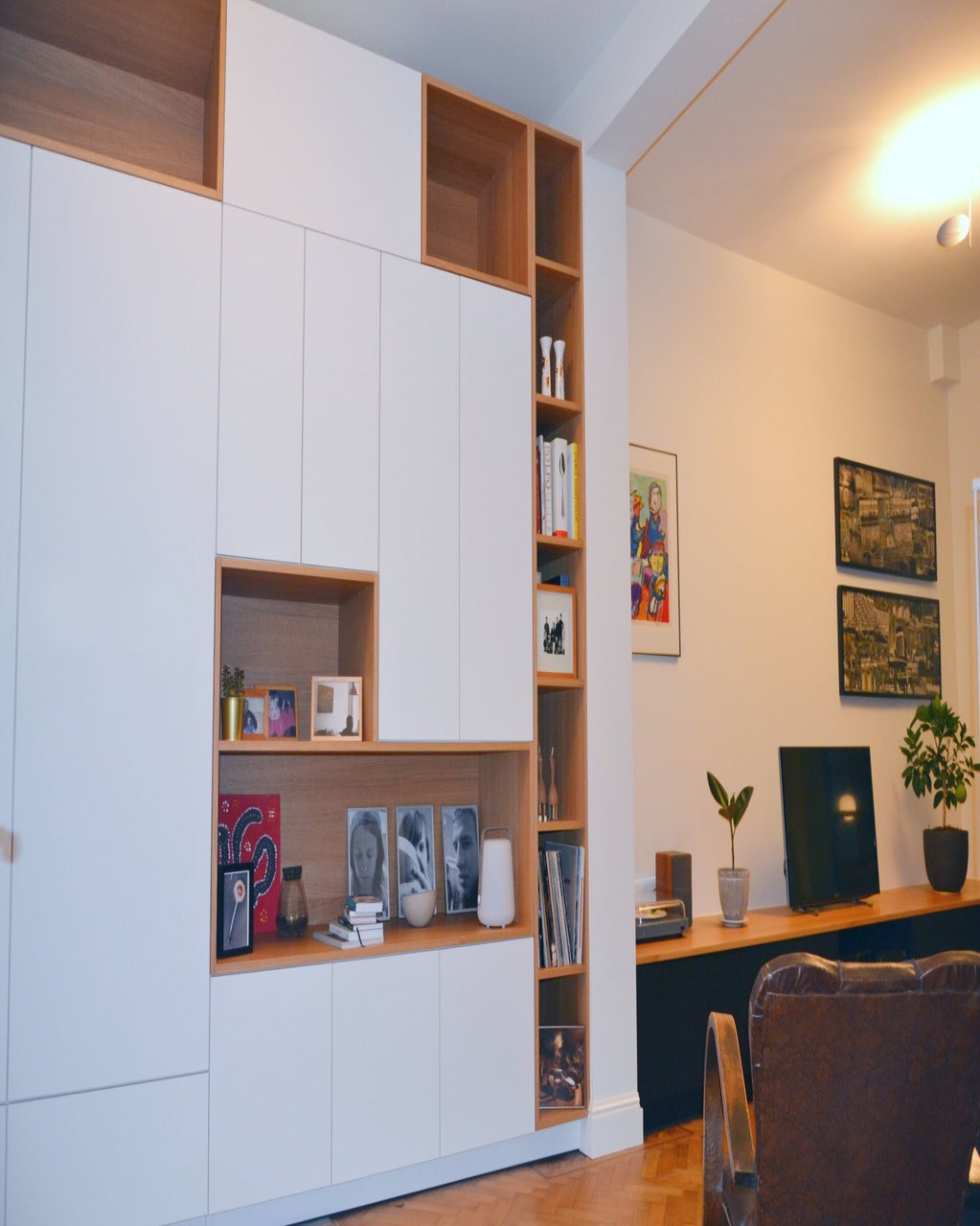 De woonruimte kreeg een nieuwe parketvloer, de muren werden aangepakt en ook hier werd een inbouwkast gemonteerd. Deze gaat volledig mee op in de ruimte en bestrijkt een hele muur. Tevens werd deze inbouwkast volledig op maat gemaakt door Colorlife.