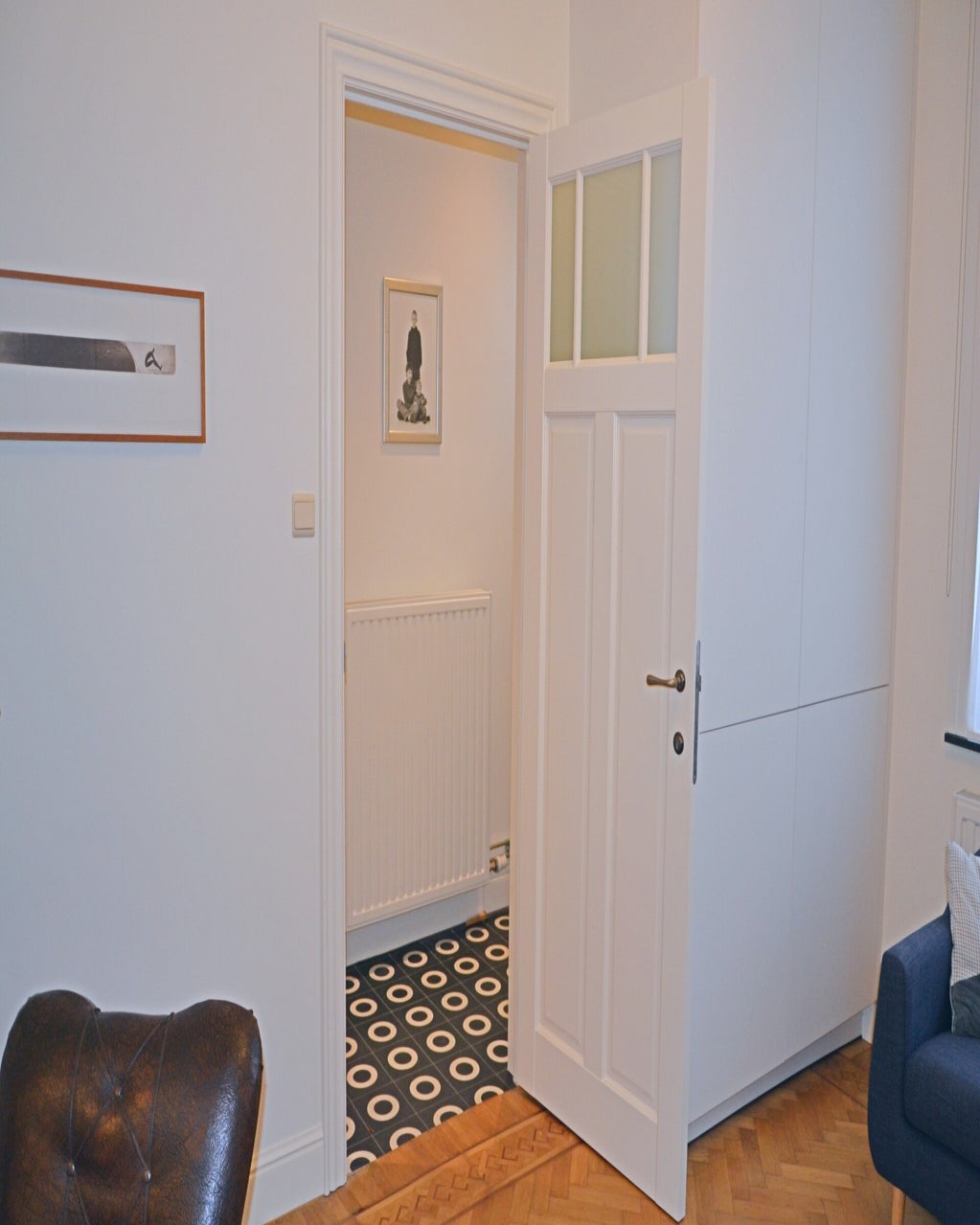 Ook werden de bestaande, klassieke binnendeuren vervangen door nieuwe, strakke binnendeuren.