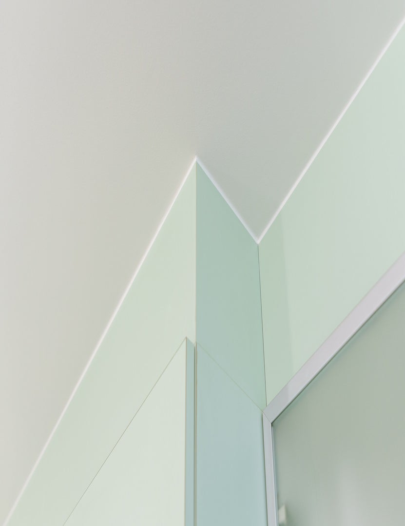 Het oude behang, dat bestond uit meerdere lagen, werd hier weggehaald. De verf- en lijmresten werden volledig verwijderd, de kleine oneffenheden in de muur werden opgevuld en alles werd nog eens perfect afgeschuurd. Zo was de muur klaar voor een nieuwe grond-en toplaag. De muur toont onmiddellijk zeer fris en straalt een modern interieur uit. De kleuren werden gekozen in samenspraak en op advies van Colorlife. We zorgen er hier voor dat de lichtrijke inval in de living en keuken ook terug te vinden is in de inkomhal en gang.